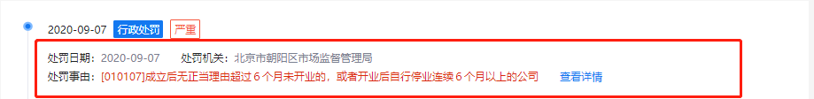 从北京再活五百年食品科技有限公司可发现,该公司的经营范围和“食品科技”毫无瓜葛。该公司还在今年6月份受到北京市朝阳区市场监督管理局的行政处罚,处罚理由是“成立后无正当理由超过6个月未开业的,或者开业后自行停业连续6个月以上的公司”。
