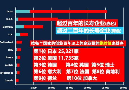 据日本长寿企业学者后藤俊夫的研究数据,截止到2014年,整个日本有260万家企业,百年企业有25321家,粗略计算,该数值是中国的25倍。