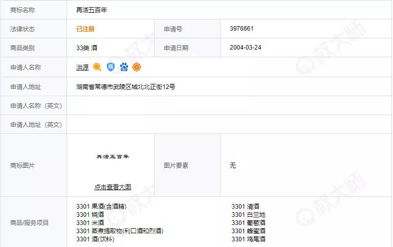 搜索结果显示,“再说五百年”商标共有34个,申请时间最早的为2004年,是名为洪源的主体在33类酒申请的,目前商标状态“已注册”。